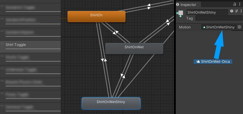 Double click the FX file (located in the Animation folder) to bring up the Animator panel. From here, click on the Shirt Toggle layer and swap out the highlighted "ShirtOnWetShiny" Motion clip with the "ShirtOnWet-Orca" variant provided.
